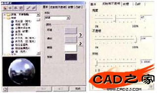 選擇“反射和不透明”屬性頁(見圖6右).調節材質本身的亮度為90%.透明度為100%,表面的折射率為1.0。