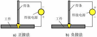 直流弧焊電源輸出端有正、負(fù)極之分,焊接時(shí)電弧兩端極性不變。弧焊機(jī)正、負(fù)兩極與焊條、焊件有兩種不同的接線法:將焊件接到弧焊機(jī)正極,焊條接至負(fù)極,這種接法稱正接,又稱正極性;反之,將焊件接到負(fù)極,焊條接至正極,稱為反接,又稱反極性。焊接厚板時(shí),一般采用直流正接,這是因?yàn)殡娀≌龢O的溫度和熱量比負(fù)極高,采用正接能獲得較大的熔深。焊接薄板時(shí),為了防止燒穿,常采用反接。在使用堿性低氫鈉型焊條時(shí),均采用直流反接。