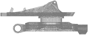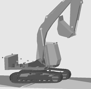 通常,液壓發掘機械的履帶系統并不象汽車一樣有彈簧、阻尼一類的懸掛系統。變形主要集中在車架和履帶系統中承重輪架上,因此準確的動力學仿真分析是有必要考慮它們的彈性變形的。RecurDyn動力學軟件可以方便地與MSC/NASTRAN、ANSYS、I-DEAS等有限元分析軟件接口,將有限元模型傳遞到RecurDyn軟件中來,從而建立起含柔性零部件的剛柔耦合機械系統。本例中柔性體從MSC/NASTRAN中生成(見圖1)。履帶系統如履帶片、承重輪、主動輪等為剛體(見圖2),均由軟件模板生成,建模非常快速有效。其他部分如配重、發動機體、駕駛艙等用等效的質量、慣量替代,與車架的鏈接采用相應的彈簧阻尼器以模擬橡膠特性。