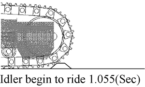 耐久性測試是每個車型必須考核的標準項目,它的目的是考察每一零部件在振動和沖擊作用下是否存在壽命缺陷。由于路面試驗測試的周期長、費用極高,仿真分析就變得非常有意義了。但在進行零部件耐久性分析之前,我們必須先準確獲取零部件受載的時間歷程,即需要準確的動力學仿真分析。然而,對于這樣復雜的動力學系統,以前的仿真分析難以給出令人滿意的動力學結果,這使得耐久性性能只能通過試驗才能確定。為了考察RecurDyn履帶式液壓發掘機械動力學仿真結果在耐久性分析上的可行性,本例對模型在加速過坎工況(見圖3)沖擊加速度進行了仿真。將結果在時間軸上拷貝,便可作為耐久性測試的載荷時間歷程數據。