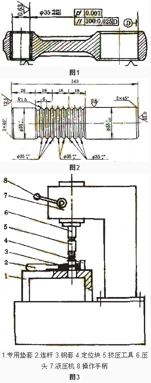 先將銅套壓入連桿小頭孔內,見圖1,在鏜床上進行半精鏜削,留0.02~0.04mm擠壓余量。然后把連桿小頭平放在液壓機專用墊套1上(見圖3所示的工作簡圖),放上圖2所示的擠壓工具5,涂些潤滑油后,扳動液壓機手柄8,使液壓機壓頭6對齊擠壓工具5、慢慢的壓下,待擠壓工具5完全通過銅套3內孔后,即完成擠壓加工工序。
