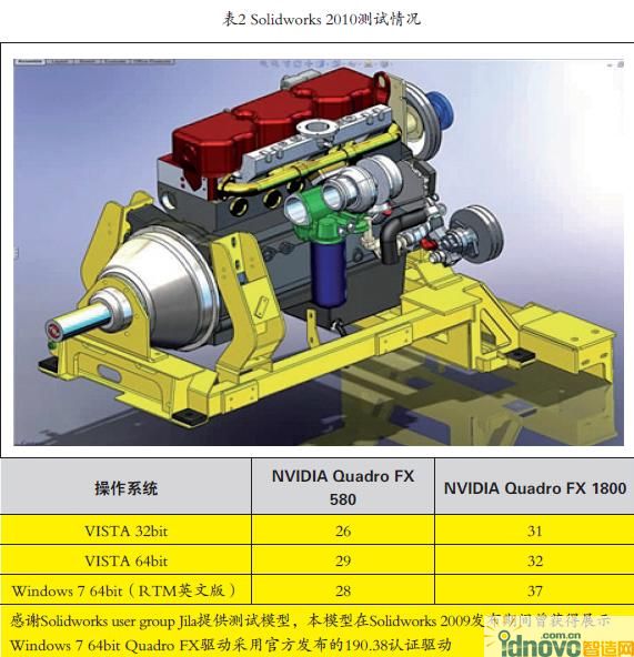 表2是Solidworks 2010在NVIDIA Quadro FX 580和NVIDIA Quadro FX 1800平臺(tái)上的性能測(cè)試結(jié)果如。測(cè)試采用Solidworks 2010 beta 和Solidworks 2010 SP0版本。數(shù)據(jù)以模型連續(xù)操作過程中,F(xiàn)rame probe檢測(cè)到幀數(shù)為準(zhǔn)。測(cè)試過程中均打開了Realview開關(guān),并將 圖形性能參數(shù)調(diào)至最高。