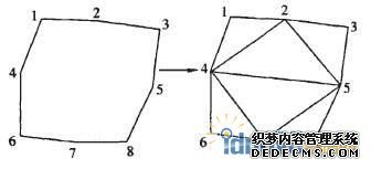 本程序采用的搜索策略為把原來一個8節(jié)點的四邊形轉(zhuǎn)化成6個三角形,如圖1所示.把一個在8節(jié)點四邊形內(nèi)搜索等應(yīng)力值的問題轉(zhuǎn)化為在6個三角形內(nèi)搜索等應(yīng)力值的問題,這樣做的好處是:①搜索簡單,在三角形內(nèi)進行搜索,出路是唯一的,涉及不到選擇搜索路徑的問題,使得搜索思路清晰、算法簡單;②不論是從外邊界開始搜索還是從單元內(nèi)邊開始搜索,永遠不會交叉,避免交叉是等應(yīng)力線搜索中的一大難點;③等應(yīng)力線的條數(shù)絕對是最全面的;④徹底消除了早期有限元后處理中存在的懸浮等應(yīng)力線問題.