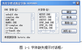 二、如果打開圖紙時,有“為文字樣式指定字體”對話框彈出,那么可以通過瀏覽未找到的字體文件。這種辦法具有應急性、臨時性,如果圖紙很多,缺少的字體很多,這種辦法會讓您麻木不堪。