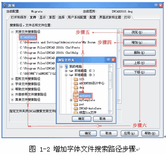 步驟五:點擊“瀏覽”按鈕,通過“瀏覽文件夾”對話框找到“D:myfonts”文件夾,點擊“確定”按鈕,如圖1-2所示。 有人問:“是不是只能增加字體搜索路徑?”答案肯定是:“NO”。CAD的很多文件都可以自定義,比如說:“字體文件、菜單文件、線型文件、填充圖案和圖塊等”。既然屬于可自定義文件,那么都可以通過同樣的方法增加自己的支持文件搜索路徑。