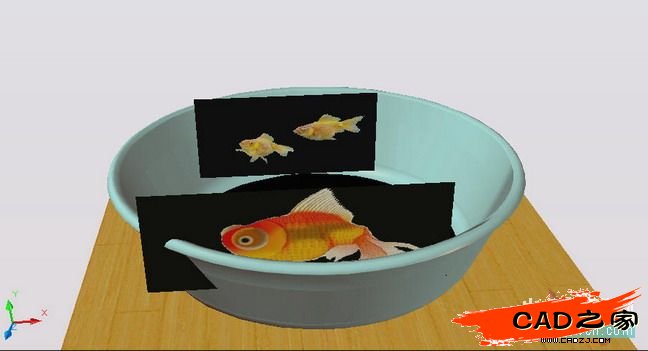 5、如果在盆中再創建兩個面域并附給不同的金魚材質(仍為透明與不透明圖片相配套的圖片),那么在“視圖樣式/真實”的界面中所得截圖如下。