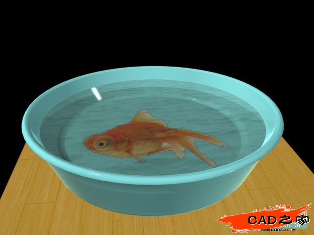 這樣設置后,就把它附給盆的底面,方法是鼠標在盆底擾動,見到盆底的線框發亮時,就按住Ctrl鍵,就將材質附上了,附上后就顯示出來一條魚了,如圖6所示: