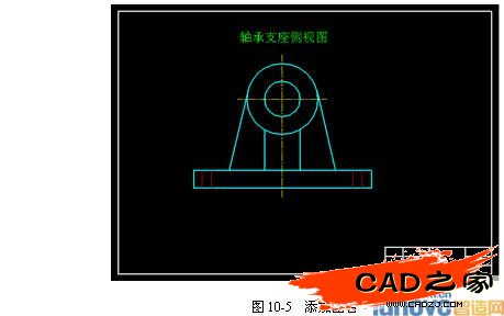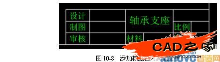 (6)重復上一步的操作,在標題欄內添加其他文字,如圖10-8。注意,其中“軸承支座”字體高度為6,其他均為5。