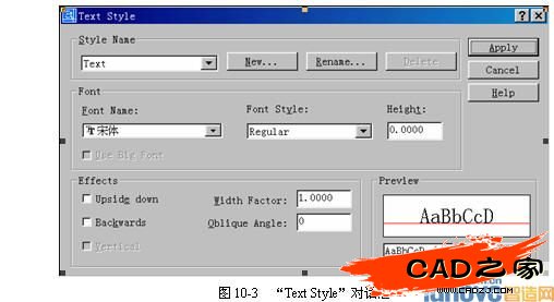 (1)在添加文字前首先選擇字體。選擇菜單【Format(格式)】→【TextStyle…(文字字體)】,彈出“TextStyle(文字字體)”對話框,如圖10-3所示。單擊New...按鈕來創建一個新的文字樣式,并命名為“Text”。在“FontName(字體名稱)”列表中選擇“宋體”項,并單擊Apply按鈕使設置生效,然后單擊Close按鈕返回繪圖窗口。