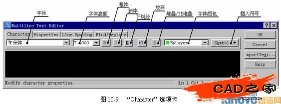 ?“Character(字符)”選項卡:如圖10-9所示,在該選項卡中除了可以進行一些常規的設置,如字體、高度、顏色等,還包括其他一些特殊設置,如: