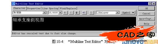完成以上操作后,系統將彈出“MultilineTextEditor(多行文字編輯器)”對話框,如圖10-4所示。在對話框的“Character(字符)”選項卡中,確認第一個列表框中為“宋體”項,并在第二個列表框中輸入“10”,然后在編輯區中輸入文字“軸承支座側視圖”。