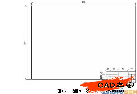 (1)首先在原來圖形的基礎上繪制邊框和標題欄。用戶可根據圖10-1所示的尺寸自行完成。