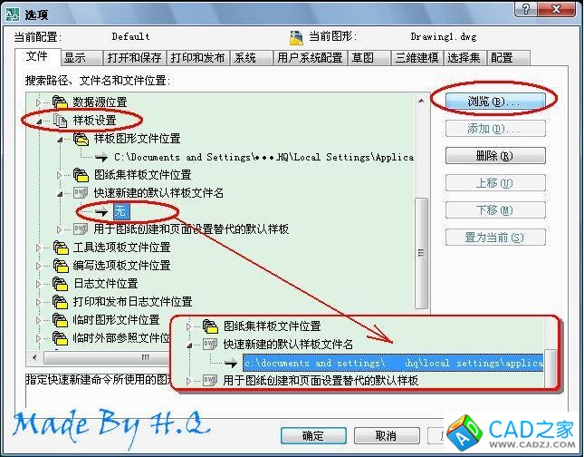 答:(1)新版本CAD要求選擇一個樣板,通常選擇acadiso.dwt就可以了,如果不想選擇樣板,可以單擊打開旁邊的下箭頭,選擇“無樣板打開-公制(M)”。(2)剛發現一個辦法:也可以預先指定一個樣本文件就可以不出現選擇樣本的對話框了,方法:菜單【工具】—【選項】—【文件】—【樣本設置】—【快速新建的默認樣本文件名】—【無】—【瀏覽】—【acadiso.dwt】—【確定】即可。