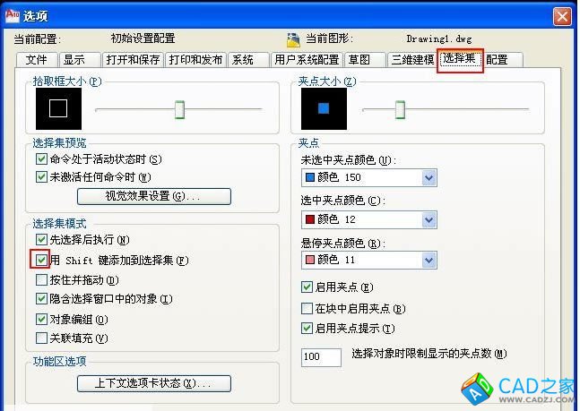 方法一:選擇工具---選項(xiàng)---選擇集,將“用shift鍵添加到選擇集”前面的“對勾”去掉則加選有效(即可以連續(xù)多選,反之加選無效。如下圖所示: