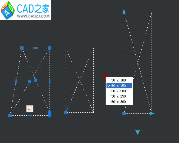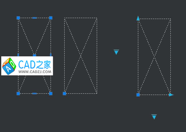 左側(cè)是繪制的普通圖形,中間是生成的普通塊,右側(cè)是定義的動(dòng)態(tài)塊。單擊各自的夾點(diǎn)我們可以發(fā)現(xiàn)他們各自的特殊之處了: