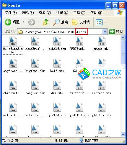 2. 當前系統中沒有漢字字體形文件;應將所用到的形文件復制到AutoCAD的字體目錄中(一般為...FONTS),如下圖所示: