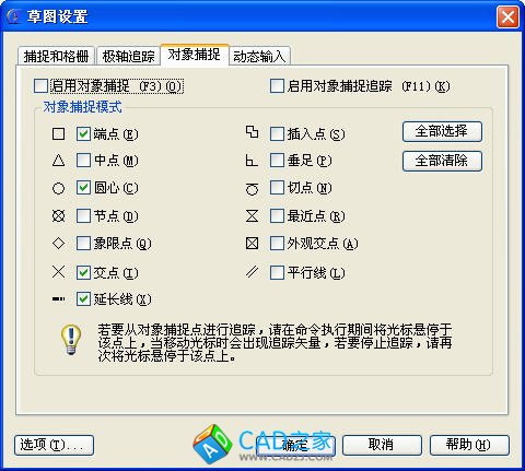 這些還不是捕捉選項的全部,CAD還增加了追蹤(TK)和計算中點(MTP)捕捉選項,這些只能通過命令來調(diào)用。
