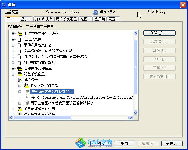 2、 單擊“文件”選項卡,在列表中找到“樣板設置”,單擊前面的加號展開下一級選項,單擊“快速新建的默認樣板文件名”,瀏覽設置一個你要使用的模板文件(*.dwt)。