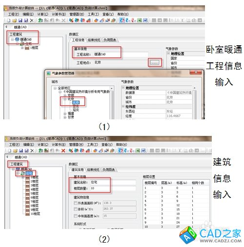 選擇【工程建筑】中的藍色圖標,在右側【數據區】輸入“暖通CAD”,選擇工程地點“北京”。其次,選擇【工程建筑】中的綠色圖標,在右側【數據區】輸入建筑名稱,樓層數量以及樓層高度、系統形式等參數,見圖2。