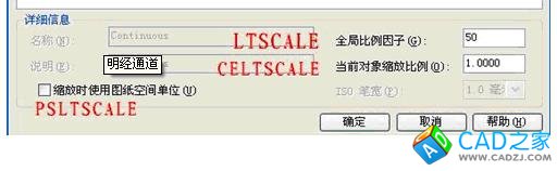 4、如圖,LT為全局比例因子,CE為當前比例因子,PS為參考布局比例因子(這個因子你或可以暫不用學習)。也即是說:ltscale對所有的對象均為絕對性有效,celtscale只對新對象(不一定為當前,僅代表它繪制之時)有效,且該對象同時也受LTSCALE的共同作用(對于某一對象來說:某個體對象線型總比例因子=ltscale*celtscale。)。也即如要用同一線形顯示出2種以上的不同類型的話,因全局因子為1,就要利用CE因子來分別設定的。