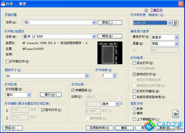 在模型或者布局狀態下按“Ctrl+P”或者點擊“文件”/“打印”,彈出打印對話框,選擇“打印機名稱”,“圖紙尺寸”,“打印區域”中選擇“窗口”,點擊“窗口”按鈕,在模型或者布局中框選出需要打印的內容,“打印偏移”點“居中打印”,“打印比例”中點“布滿圖紙,”圖形方向“中根據自己的需要選擇”橫向“還是“縱向”,可以先“預覽”按鈕看看是不是自己想要的樣式,滿意的話就點“確定”吧!