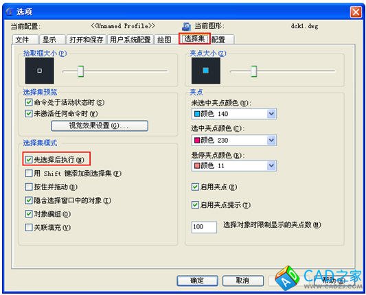 將此變量設(shè)置為1跟在“選項(xiàng)”對(duì)話框中勾選“先選擇后執(zhí)行”效果相同。