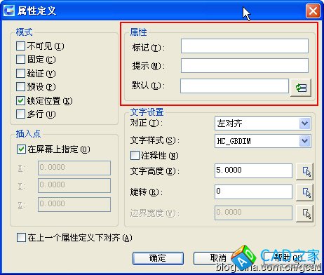 在CAD定義圖塊屬性的時候,可以看到三個輸入框,分別是標記、提示、默認,如下圖所示。