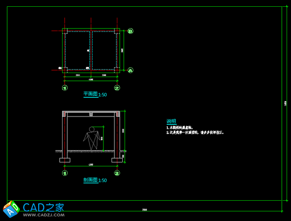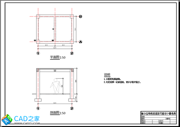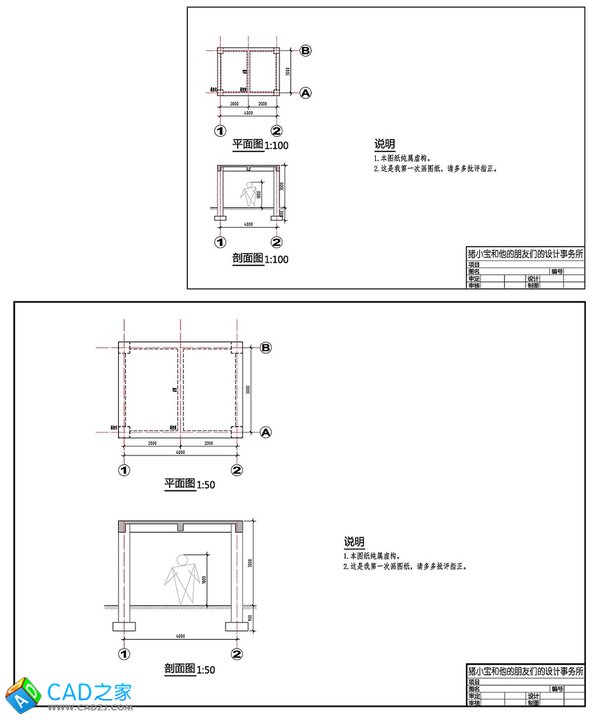 在「打印出來的紙質圖紙」世界里,上面的是一張A4圖紙,圖紙比例是1比100;下面的是一張A3圖紙,圖紙比例是1比50。如果你拿尺子量一下,所有的文字高度、標注尺寸的大小、標題的大小、圖簽的大小都是一樣的。唯一的區別就是小房子放大了兩倍,1號和2號軸線在上面圖紙里的實際量出來的距離是40毫米,在下面圖紙里量出來的是80毫米。對比一下兩張圖,是不是下面這個A3的更清晰更醒目呢,看來主任還是有道理的。