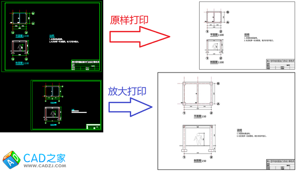 對比一下「CAD 的虛擬模型空間」和「打印出來的紙質圖紙」,小王把上面一張原樣打印(1比100),就得到了圖紙比例為1比100的A4圖紙;把下面一張放大兩倍打印(1比50),就得到了圖紙比例為1比50的A3圖紙。從而實現了在這兩張「打印出來的紙質圖紙」上,文字、標注、標題、圖簽一樣大,但是小房子放大了兩倍。