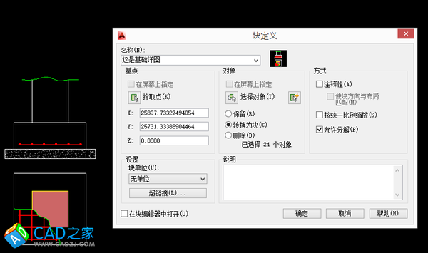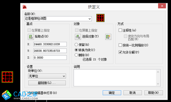 比如把這個框架柱的詳圖定義為一個名叫「這是框架柱詳圖」的塊,因為后面還需要縮放操作,塊單位最好設置為無單位。