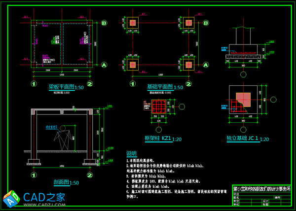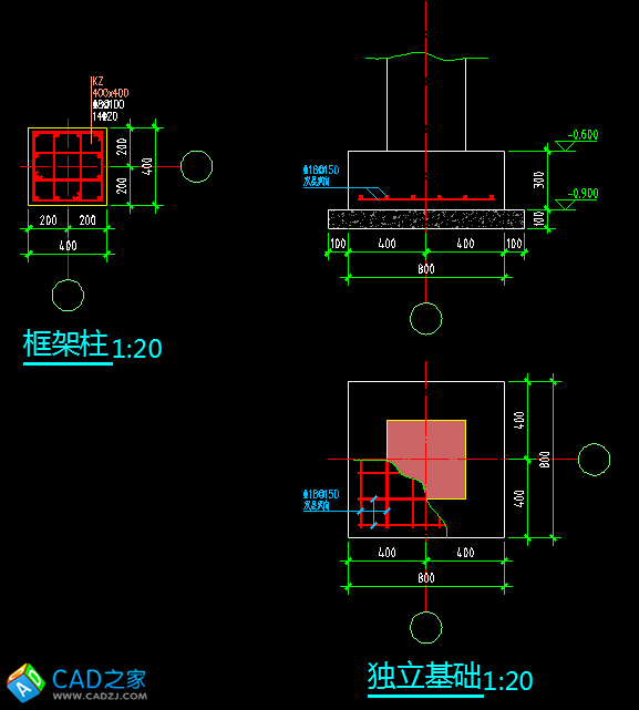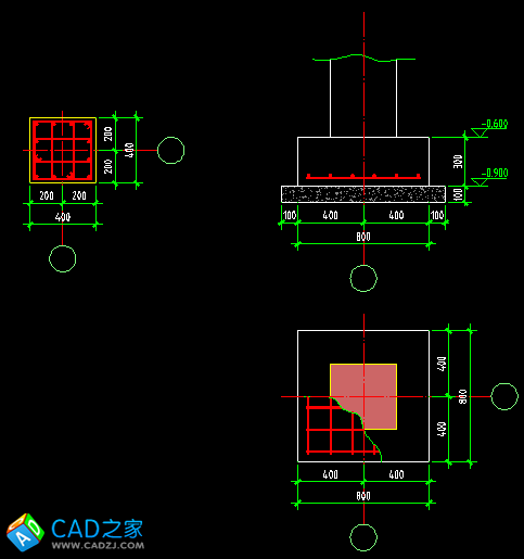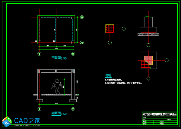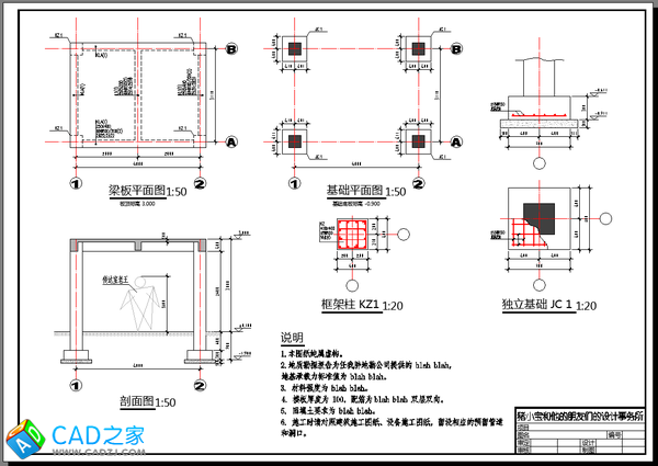 小王拿著這張新的A3圖紙再去找主任,主任一看,「吆,這么快就做好了,不錯不錯。恩,有了平面剖面了,再加一個柱子和基礎的詳圖吧,一般用1比20的,就放到同一張圖紙上。怎么樣?」