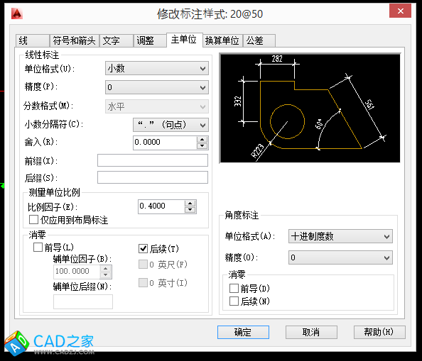 應該怎么辦呢?可以新建一個標注樣式,名字叫做20@50,意思就是1比20的詳圖用在1比50的平面圖里。跟50@50相比,只需要修改一個地方,也就是把測量單位比例從1修改成0.4(20除以50等于0.4)。其余設置完全相同。