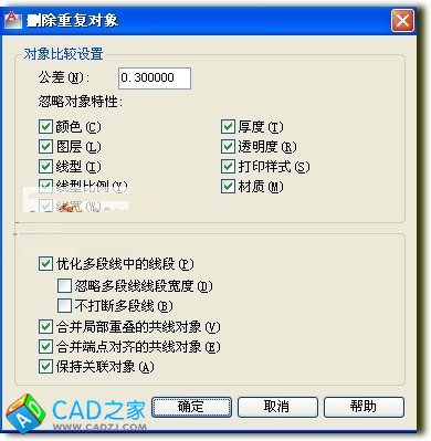 彈出“刪除重復(fù)對(duì)象”對(duì)話(huà)框。在這里設(shè)置清理參數(shù)即可。