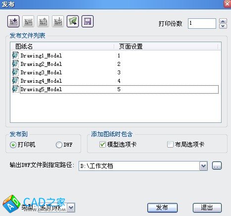 設置完成后,選擇“文件”—“發布”的功能,調出發布功能對話框。由于只是在模型空間打印,所以只選擇“模型選項卡”,發布到打印機即可。最重要的是,將頁面設置由默認修改為之前設置的名稱“1、2、3、4、5”,然后點擊“發布”,軟件就可以將所有的圖紙一次性打印出來了,在一定程度上也節省了的精力和時間,顯的非常方便和快捷。