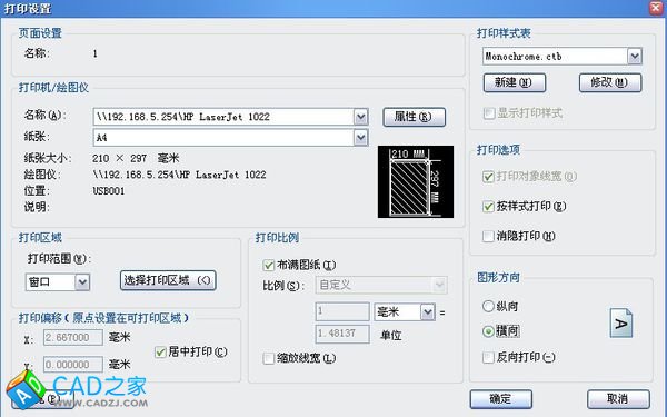 首先,進行打印設置方面的配置。選擇相應的打印機、紙張、打印樣式,然后按照需要設置其他的打印參數。由于該功能自動打印是對每張圖紙圖框的識別,因此需要讓軟件能自動識別圖紙的圖框,比如打印5張圖紙,則需要軟件能主動識別出5個圖框。在軟件里提供了3種方式:圖塊(圖框為特定圖塊)、圖層(指定圖層為封閉矩形)、散線(圖框為散的直線)。一般來說,如果需要打印的圖紙圖框是某個特定圖塊,那么可以直接選擇第一種方式,比較方便。但是如果圖紙的圖框在圖塊或者圖層的設定上比較隨意,那么軟件就無法自動判斷出圖框了,這時候需要“幫助”,手動繪制一個特定層的封閉矩形來實現。例如在這個例子里),可以設置一個圖框層,并設置為不打印。