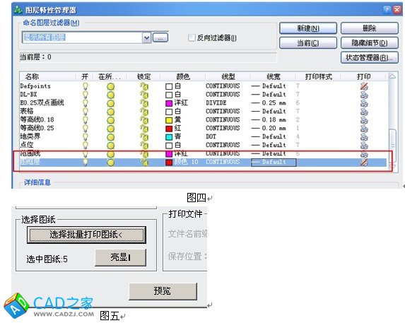 然后,將層切換到圖框層,將需要打印的5張圖用矩形框起來。 接著,調出批量打印界面,將圖框形式選擇為圖層,圖層名選擇為:圖框層。然后點擊“選擇批量打印圖紙”,框選整個圖紙,確定之后,自動彈出批量打印界面,顯示如下信息: