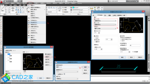 新建尺寸標(biāo)注 如圖所示,格式-標(biāo)注樣式,打開“標(biāo)注樣式管理器”對(duì)話框,單擊“新建”按鈕,打開“創(chuàng)建新標(biāo)注樣式”對(duì)話框,單擊“繼續(xù)”按鈕,打開“新建標(biāo)注樣式”對(duì)話框,切換至“符號(hào)和箭頭”選項(xiàng)卡,將“箭頭”切換為“建筑標(biāo)記”,完成其它設(shè)置,單擊確定按鈕,關(guān)閉所有對(duì)話框。新建尺寸標(biāo)注如圖中右下角所示。