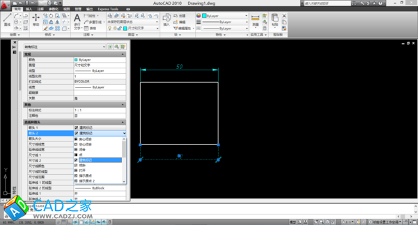 已有尺寸標(biāo)注 如圖所示,雙擊尺寸標(biāo)注,打開“特性”對(duì)話框,切換“箭頭1”和“箭頭2”為“建筑標(biāo)記”,切換完畢立即生效。