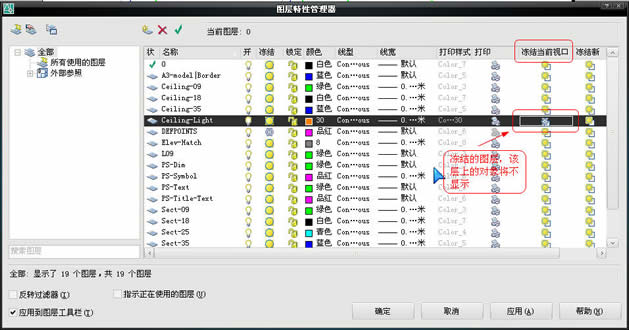 這是一個很重要的功能,比如可以利用此功能將平面布置圖及頂棚平面圖中的對象畫在一個房間平面內,然后在布局中開兩個視口(當然不在一個布局中也可以),分別顯示平面布置圖而隱藏頂棚平面圖的對象(如燈具)和頂棚平面圖而隱藏平面布置圖的對象(如家具),以達到各取所需的目的。