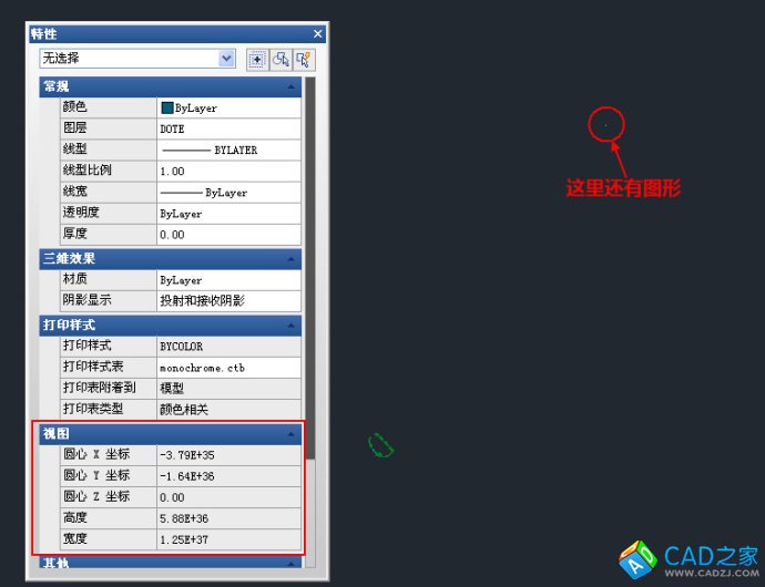 當我們不選擇任何對象打開特性面板時,在視圖部分可以看到當前視圖中心的坐標和當前視圖的高度和寬度,我們看到這張圖中這些數(shù)據(jù)已經(jīng)無法使用普通的數(shù)據(jù)顯示了,都使用了科學計數(shù)法,而且是35以上,也就是當前視圖高度的數(shù)量級已經(jīng)達到了10的36次方了,初略算了一下,這個長度已經(jīng)達到幾十億億光年,已經(jīng)遠遠超出了人類目前所探知到宇宙的邊界了。仔細看圖的右上方有個小點,就是剛才選中圖形后顯示夾點的地方,我想那可能是主圖形所在的位置。