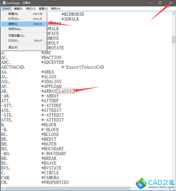 在記事本中找到“AR, *ARRAY”在ARRAY后哦面添加CLASSIC,然后保存關閉記事本,重新啟動CAD,發現熟悉的陣列對話框又出現了。O(∩_∩)O~~