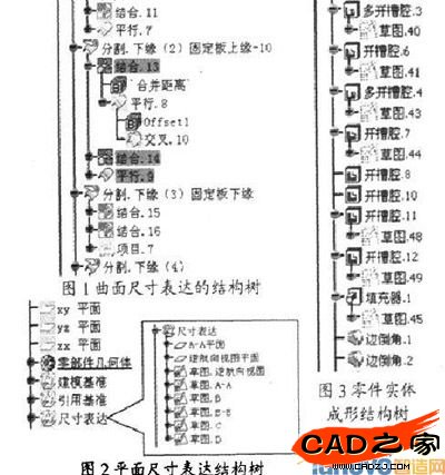 所有零件內、外形線均由Splitting生成。每個"分割線"由3個子操作組成(被分割的線、用來切割起始端的線、用來切割終端的線),操作均用右鍵方式以保證子操作集成于父操作下。同理,"被分割的線"、"用來切割起始端的線"和"用來切割終端的線"如果有子操作也用右鍵方式以保證子操作集成于父操作下。圖1是尺寸表達的結構樹。