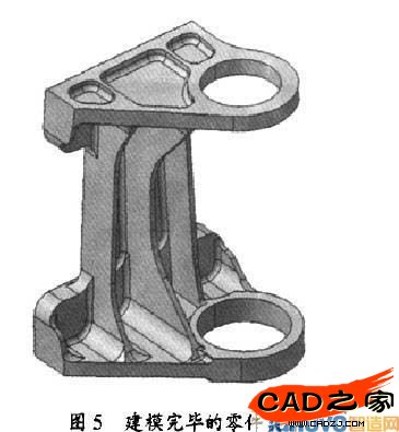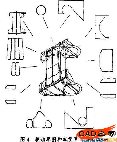 由于零件的所有主要幾何尺寸、外形和內形線已經在驅動草圖中完成了定義,在其后的三維建模步驟中,成形草圖只需要選取二維驅動草圖中的相應線條投影即可得到,而不必使用尺寸定義的方法精確作圖。
