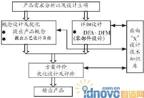 典型的DFX設計流程,其產品的開發以產品需求分析為第一步,以此順序展開,再到概念設計及初步設計方案,到方案評價,到詳細設計,到優化設計及評價,直至最終設計成果輸出。其主要的設計流程依然是個順序設計過程。筆者在結合并行工程對產品設計過程進行適當重組,另外在此基礎上加入了智能設計的成果,即方案評價與優化設計這兩步,提出如圖2所示的設計流程模型。