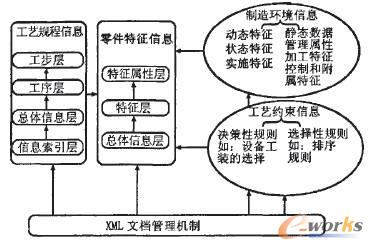 CAPP系統中的數據,可以分為零件特征信息、工藝規程數據、工藝約束信息和制造環境數據。零件特征信息是來自設計階段零件的幾何數據、拓撲關系描述數據和技術要求數據,是對零件特征的描述;工藝規程數據包括表示零件制造的工藝過程和操作方法的所有文件,工藝過程卡片、工序卡屬于工藝規程數據進行工藝設計各階段的中間結果也是工藝規程數據;工藝約束信息,是生產流程中系統受到的約束條件,是進行工藝設計不可忽略的信息,是進行工藝決策必須參照的規則;制造環境數據是CAPP的主要設備資源數據,分為對設備的管理信息和設備自身的靜態特性數據和動態特征數據。