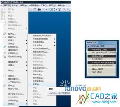 Pro/E軟件提供兩種模式來創建管道,即零件模式和組件模式(圖1和圖2)。兩種方式適用范圍不同,但對于設計空間結構復雜的直管、軟管,都較方便。三維虛擬裝配設計,是對設備深入認識的一個過程。三維管道,為后續理論分析分析打下堅實的基礎。