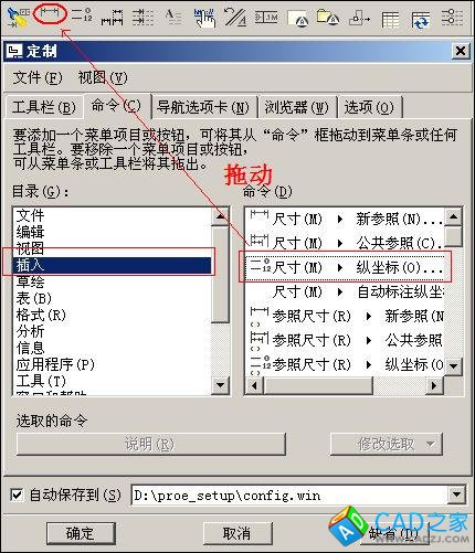 3.設(shè)置縱坐標(biāo)圖標(biāo),點(diǎn)選“工具”菜單->“定制屏幕”在“定制”對(duì)話框中把縱坐標(biāo)圖標(biāo)拖動(dòng)到工具條中,如圖5。