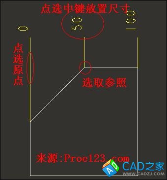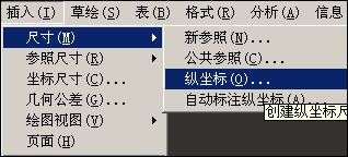 2.現(xiàn)在已經(jīng)創(chuàng)建了縱坐標(biāo)的原點(diǎn),下面來(lái)標(biāo)注其他縱坐標(biāo)尺寸。點(diǎn)選“插入”菜單->“尺寸”->“縱坐標(biāo)”,如圖3。按照提示,首先選擇縱坐標(biāo)原點(diǎn)尺寸界線,再點(diǎn)選要標(biāo)注的尺寸的參照,選擇合適的位置放置尺寸,如圖4。