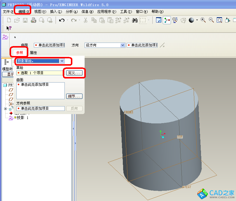 在proe菜單欄點擊“編輯”——“投影”——“參照”——“投影草繪”。如圖: