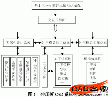 沖壓模具按工藝性質可分為沖裁模、彎曲模、拉伸模、成形模等,無論何種模具,基本上都需要上、下模體、導向裝置、壓料裝置、定位裝置等,因此沖壓模具CAD 系統是集沖壓模具設計系統、沖壓模具加工仿真、沖壓模具工作仿真為一體的方便易用的設計系統,系統構成如圖1 所示。圖2 為該系統在Pro/ E環境下運行的一個界面。